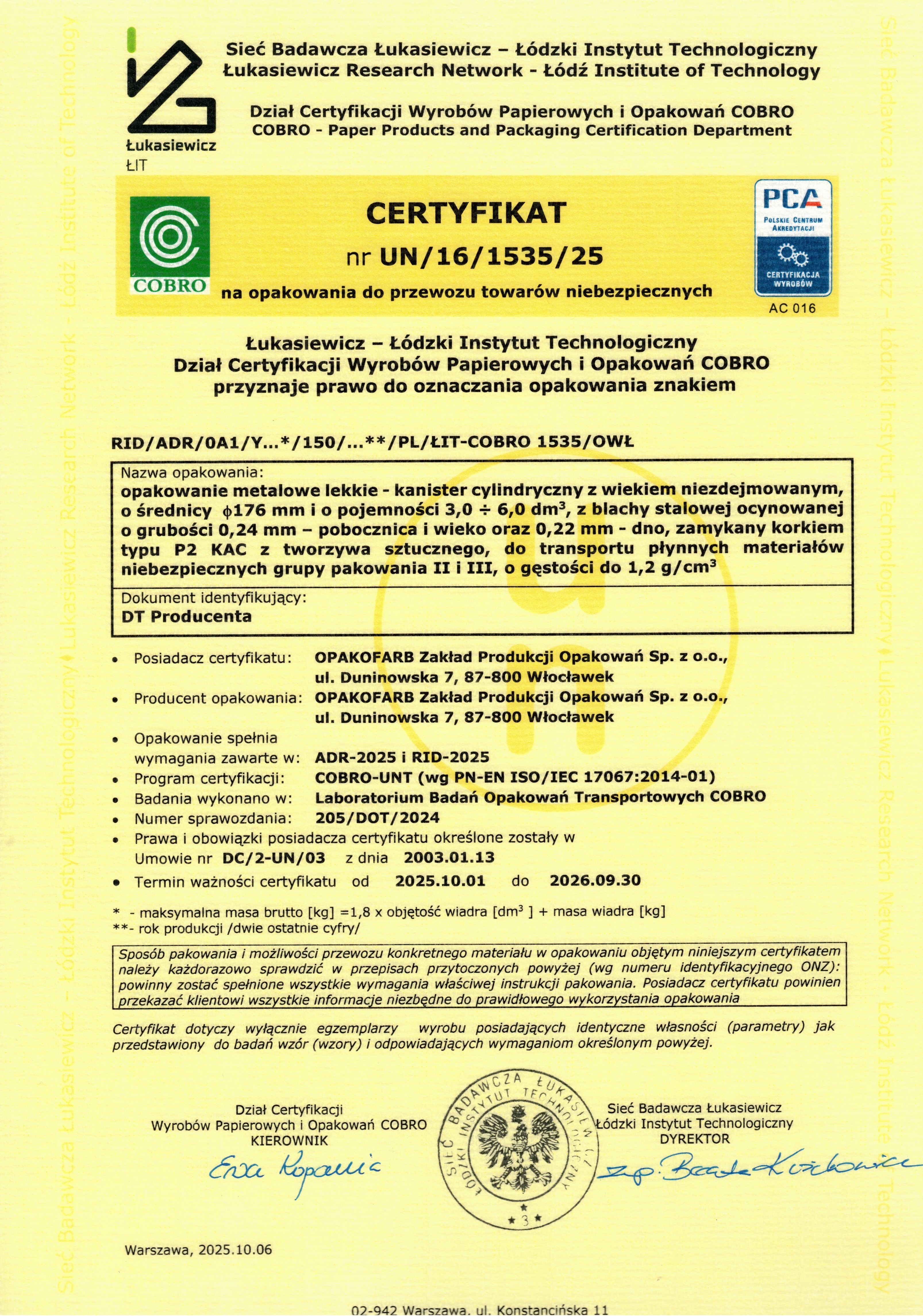 Kanister wykonany jest z blachy ocynowanej. Denko i wieczko są podwójnie zawalcowane do pobocznicy i uszczelnione uszczelką z masy uszczelniającej. Kanister wyposażony jest w uchwyt tworzywowy zgrzany do wieczka oraz korek wylewowy w kształcie lejka z plombą, Na życzenie zamawiającego wszystkie typy kanistrów mogą mieć wytłoczony na pobocznicy trójkąt - znak ostrzegawczy przed substancjami niebezpiecznymi.