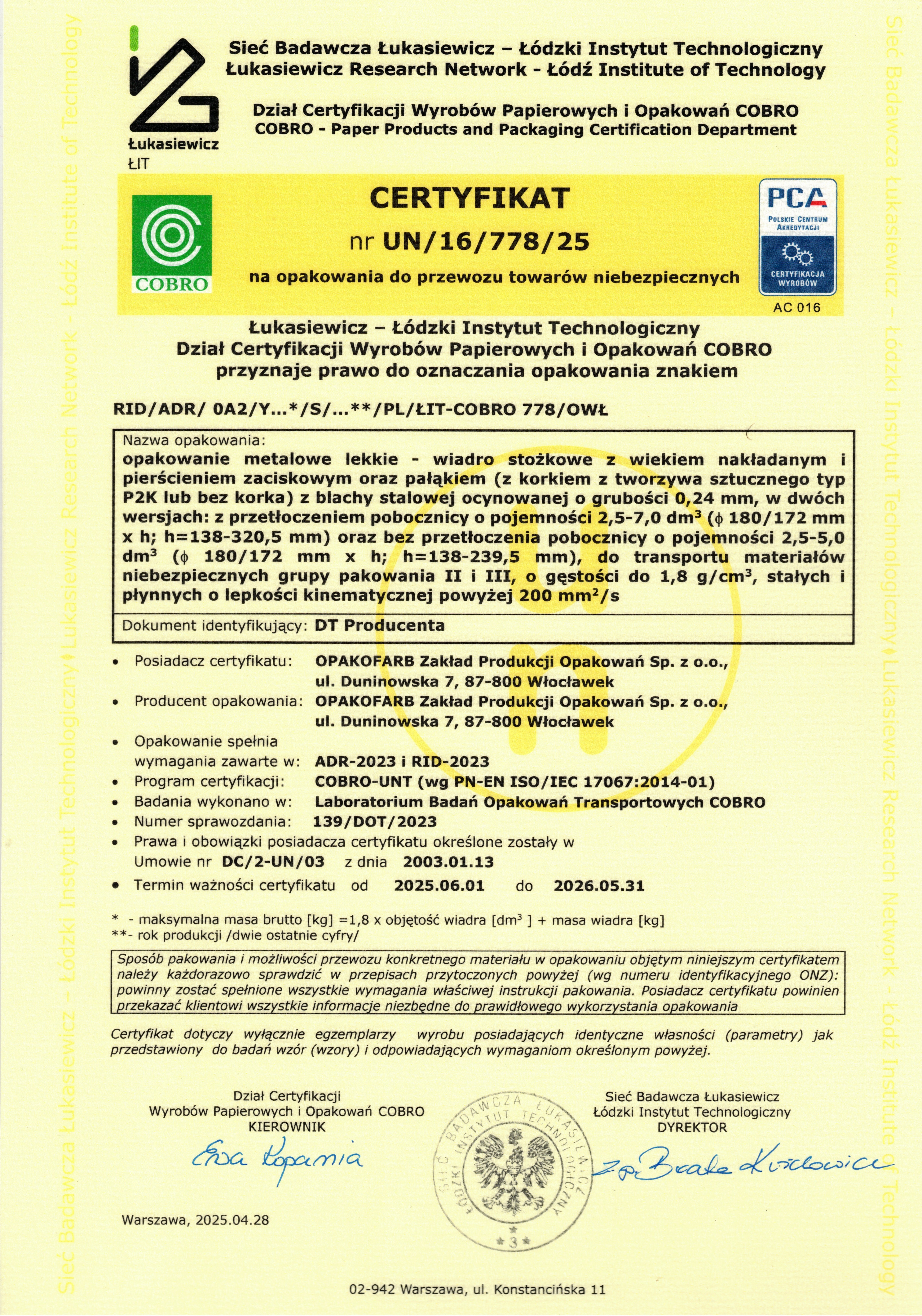 Wiadro wykonane jest z blachy ocynowanej. Zamknięte wiekiem nakładanym, połączonym z pobocznicą pierścieniem z zaciskiem dźwigniowym zabezpieczonym przed otwarciem plombą. Uszczelnienie wieka wykonane jest z masy uszczelniającej. Zawalcowanie dna z pobocznicą uszczelnione jest uszczelką z masy uszczelniającej. Dla wiader o pojemności od 2,5 l do 7,0 l kabłąk wykonany jest z drutu ocynkowanego Ø 2,7 mm; dla wiader o pojemności od 10,0 l do 20,0 l kabłąk wykonany jest z drutu ocynkowanego Ø 3,9 mm z uchwytem z tworzywa sztucznego. Na życzenie zamawiającego wiadra o pojemności 2,5L - 5L oraz 10L -12L mogą być wykonane w wersji z przetłoczeniem pobocznicy lub bez przetłoczenia pobocznicy. Wiadro może posiadać zabezpieczenie powierzchni pod wyroby wodorozcieńczalne. Wszystkie typy wiader mogą mieć wytłoczony na pobocznicy trójkąt - znak ostrzegawczy przed substancjami niebezpiecznymi.
