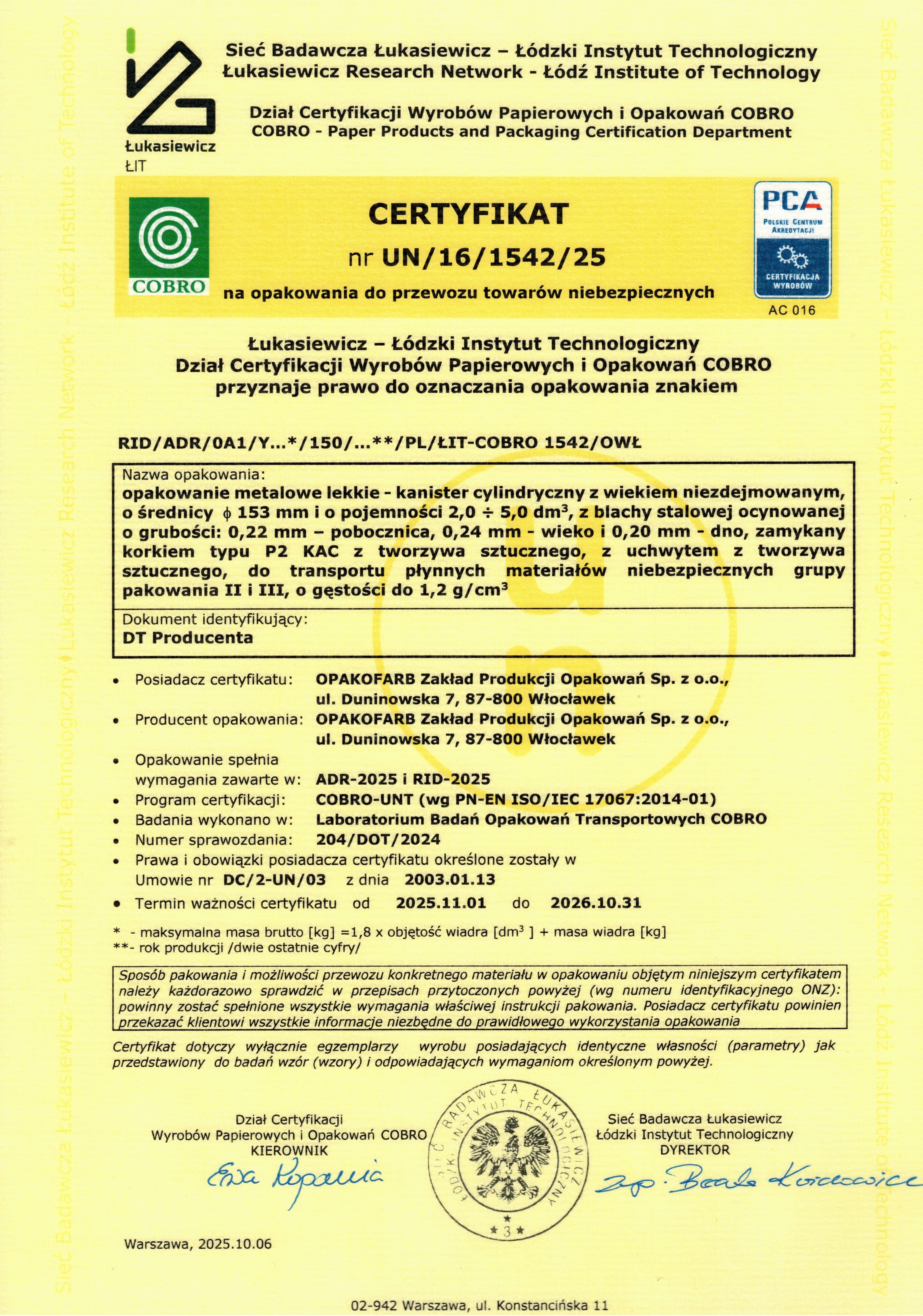 Certyfikat na opakowanie