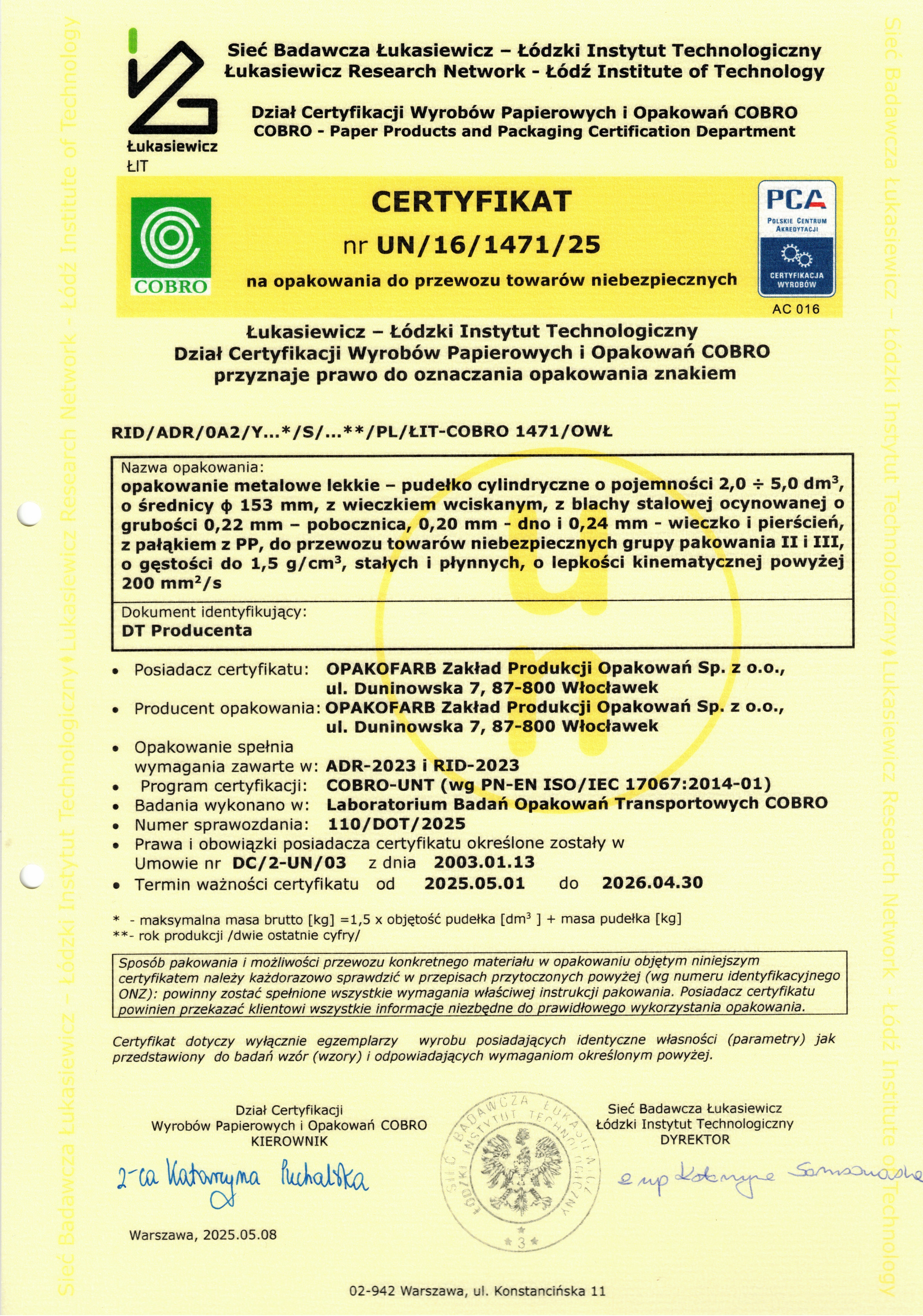 Certyfikat na opakowanie